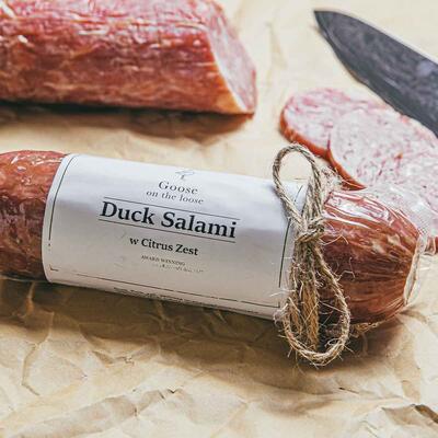 Australian premium Duck breast blended with Pepper and Citrus Zest, provides us an amazing new flavour profile. This bold flavour pairing makes this Salami ideal to serve alongside sharp cheese such as Parmesan and Vintage Cheddar, or served tossed into a summer salad. Its best matched with a Gin & Tonic, dry Champagne or an ice cold Beer.