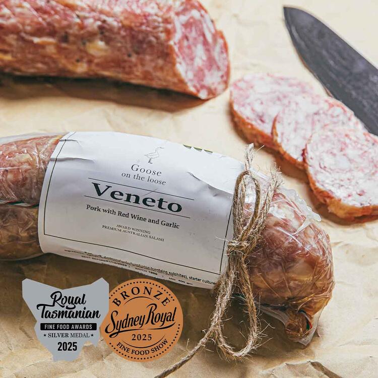 Named after the Italian region that is home to Venice and Romeo & Juliet, the Veneto Salami is made with fresh ingredients including premium free range Australian Pork and is naturally soft and noted for its lovely flavour that can only come from traditional dry curing. Blended with a subtle infusion of Red Wine, Pink Sea Salt and Cracked Pepper it’s the ideal family all rounder and always a popular choice with our Italian customers. Eat straight from the packaging sliced on a cheese board or serve in a sandwich, also great tossed through pasta or potato salad. Due to its easy going flavour profile Veneto can be enjoyed by the whole family and eaten with pretty much anything – literally!