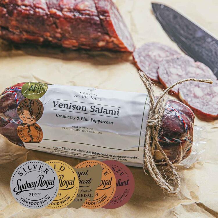 Free range Fallow Venison Salami traditionally fermented and dry cured. Fallow Venison is a European variety farmed in Australia and highly valued for its tender texture and beef-like flavour. The Cranberry and Pink Peppercorn combination give this soft flavoured Salami a lingering exquisite sour and peppery aftertaste. It’s ideally served on a platter with a mild flavoured cheese, dried fruit, nuts and accompanied by a light bodied beer or ‘Hunter Valley’ style wine.